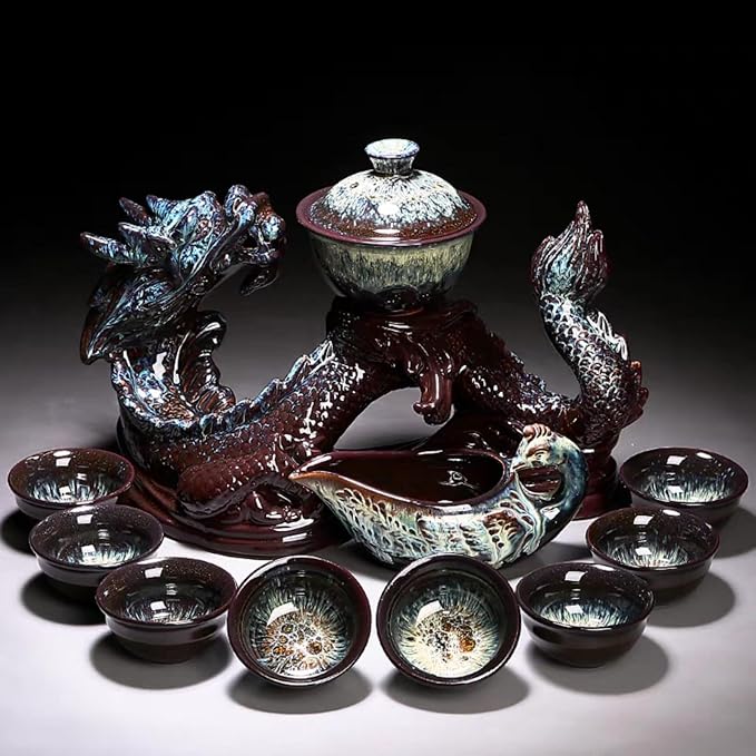 - Package Includes: Dragon shaped tea set base * 1,Shared Pot * 1,Tea bowl * 1,Tea bowl lid* 1,Tea cups*8.