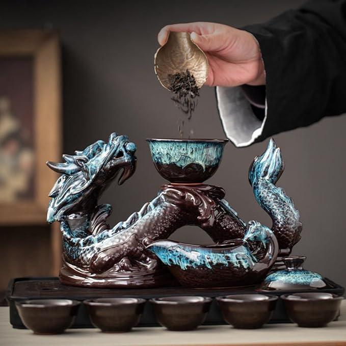Chinese Gongfu Tea Set - Ceramic Teapot with Infuser, 8 Cups, Semi Automatic Dragon Design for Loose Leaf Tea