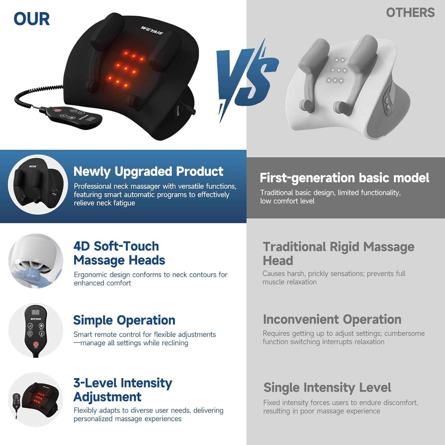 - Soothing Heat Therapy + Adjustable Intensity:Enhance your neck pain relief with an integrated heating pad adjustable from 38°C to 45°C, promoting blood circulation. Three intensity levels (gentle, standard, strong) can be easily adjusted on the neck and shoulder massager with heat to meet your needs
