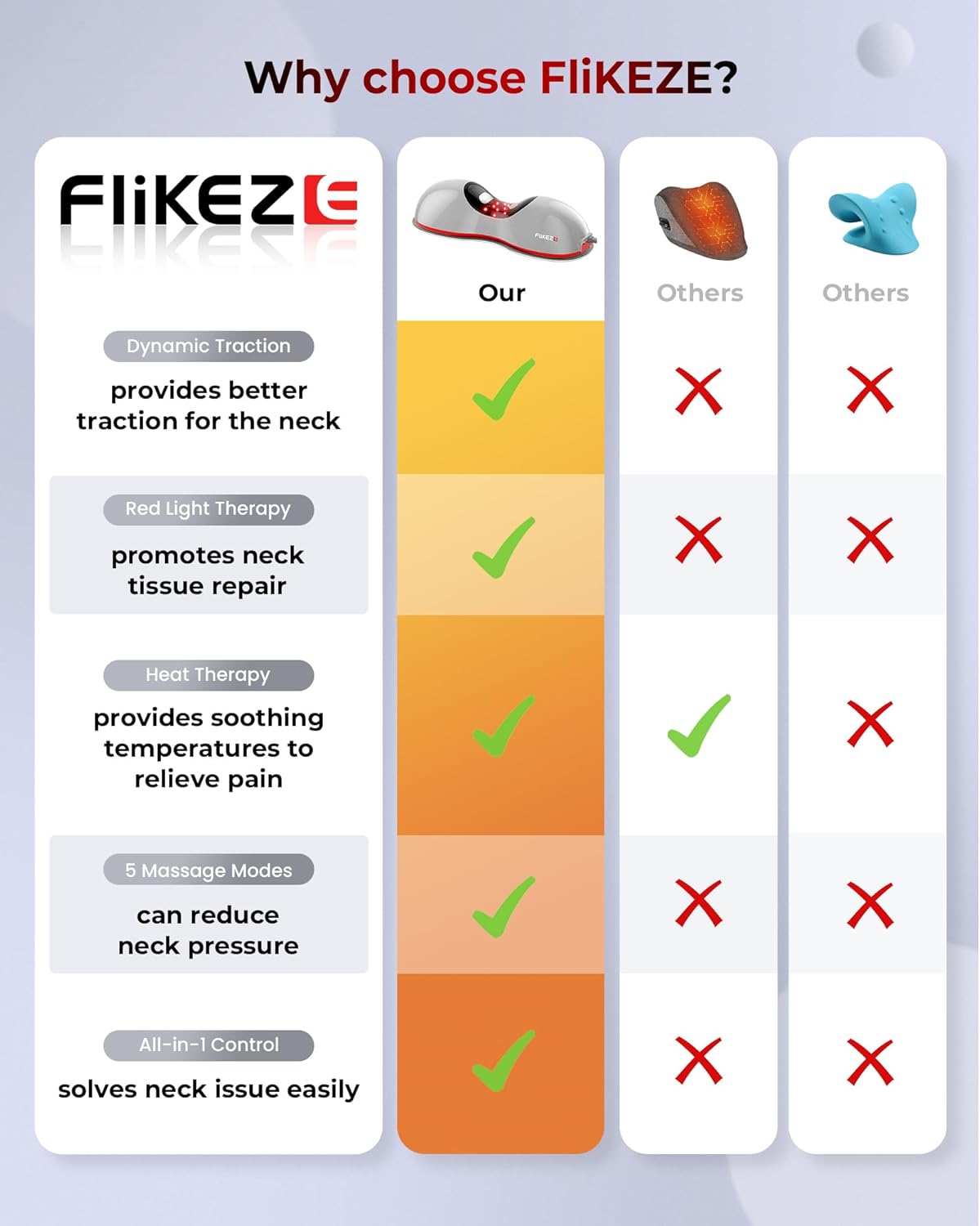 - 【Feature with Red Light Therapy】FliKEZE neck traction device adopted new red light therapy technology that can promote the metabolism and tissue repair of neck cells, better relieve the tension and spasm of neck muscles. The cervical traction device is very suitable for people with tension headaches, TMJ, poor posture, tech neck or neck problems and pain.