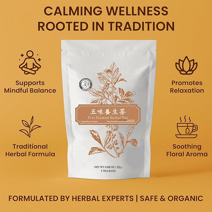 Five Element Herbal Tea Bags With American Ginseng, Chrysanthemum, Goji Berry, Jujube, And Citrus Peel | Herbal Blend For Immunity, Balance, And Vitality | 5 Count Wellness Tea Bags
