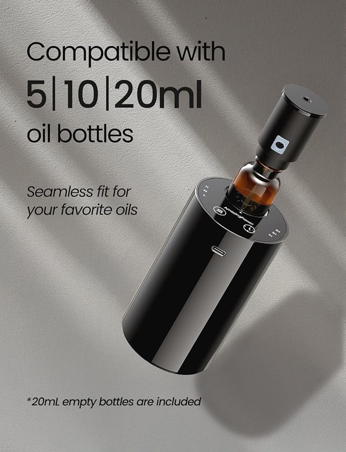 - 【Quick and Hassle-Free Setup】This mini diffuser works with standard US 5/10/15/20mL essential oil bottles for quick, no-fuss setup. Just remove the cap and either fill the included empty bottle with your favorite essential oil or twist your retail oil bottle directly onto the nozzle. No spills, no mess—just easy, clean aromatherapy.