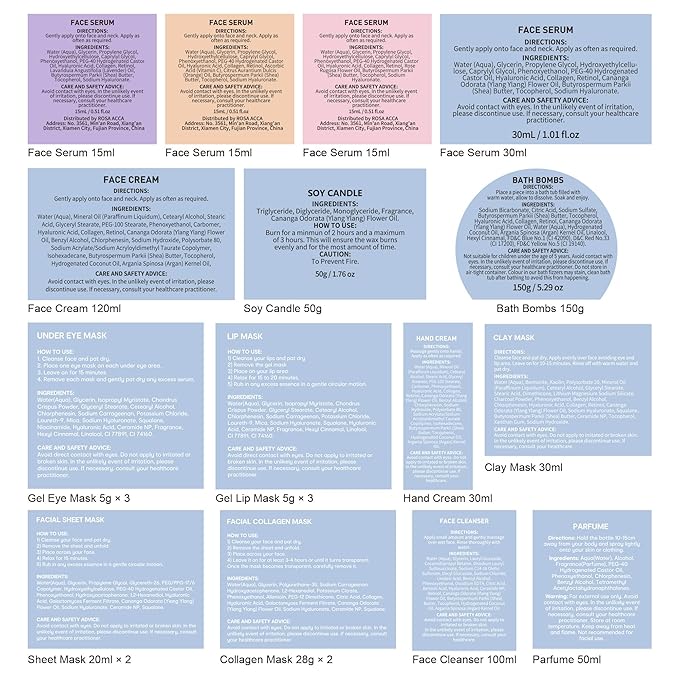 - 33 Pcs Advanced Skin Care & Spa Set: This gift set contains premium ylang essential oil products with 100ml face gel cleanser, 30ml hand cream, 120ml face cream, 2 pcs sheet face mask, 2 pcs gel mask, 3 pcs gel under patches, 3 pcs gel lip mask, 30ml clay mask, 30ml lavender face serum, 15ml orange face serum, 15ml yalng ylang face serum, 15ml rose hyaluronic acid face serum, gua sha, face clean sponge, 150g bath bombs, lip gloss, silk sleep mask, spa headband, bath puff, fuzzy sock, silk hair tie, earlugs, eyebrow razor, necklace, perfume, leather cosmetic bag