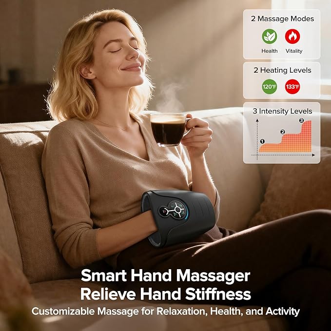 - Cordless & Portable:Customizable comfort with 3 massage modes, 3 intensity levels, and 2 heat options (113-122 ºF), tailor your hand massage to your preference. The timer ensures safe and convenient use, with automatic shutoff after 10 minutes