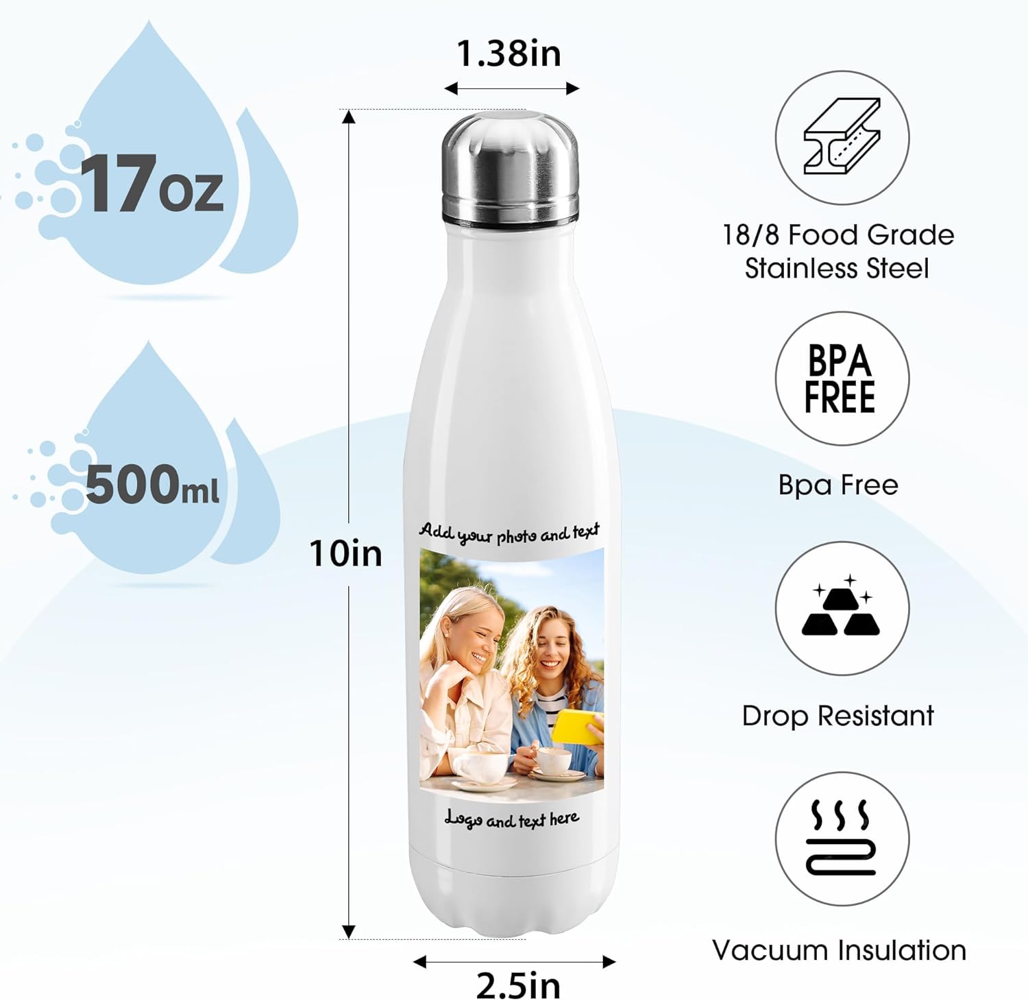 - Multi-Scenario Applicable: This personalized water bettle has a 17oz capacity, which is just right. Combined with your customized content. Whether for daily use at home, refreshing yourself at the office, or during outdoor picnics or travels, it can be conveniently carried and provides drinks at the appropriate temperature for you anytime and anywhere.