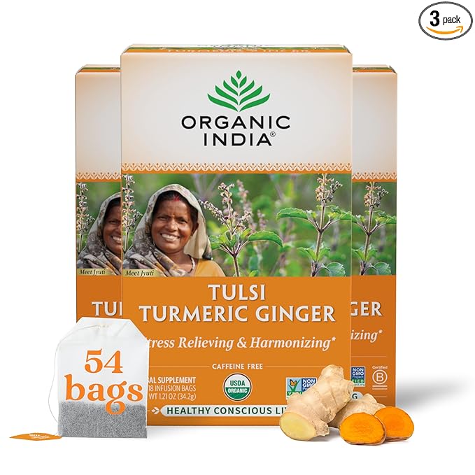ORGANIC INDIA Tulsi Tumeric Ginger Herbal Tea - Stress Relieving & Harmonizing, Immune Support, Aids Digestion, Vegan, Caffeine-Free - 54 Infusion Bags, 3 Pack