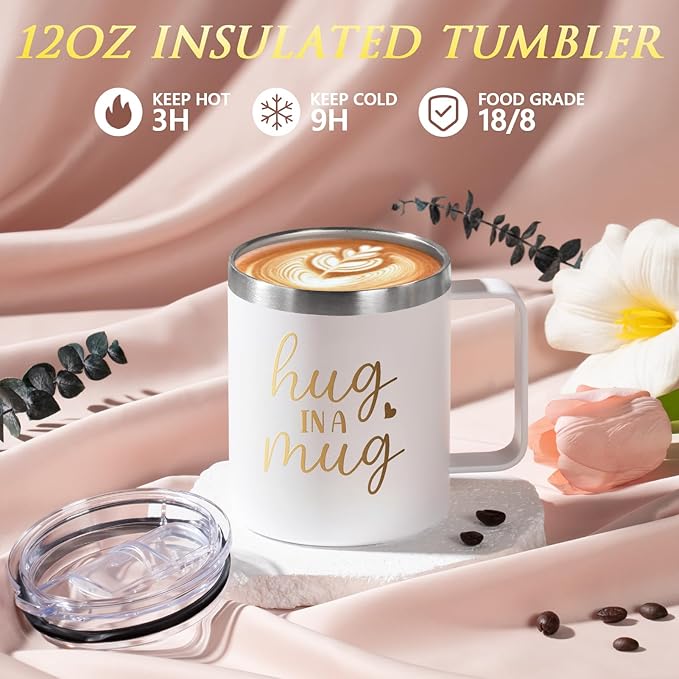 - INSULATED TUMBLER WITH HANDLE: Crafted from premium 18/8 food-grade stainless steel, BPA-free, this 12oz tumbler features a double-wall vacuum insulated design to keep drinks cold for up to 9 hours & hot for up to 3 hours. “Hug in a Mug”—a warm reminder that someone cares. Whether for a quiet break or a peaceful moment, the tumbler brings the comforting warmth of a hug to soothe your heart. Perfect as cheer up gifts sending hug gifts stress relief gifts encouragement gifts for women best friends