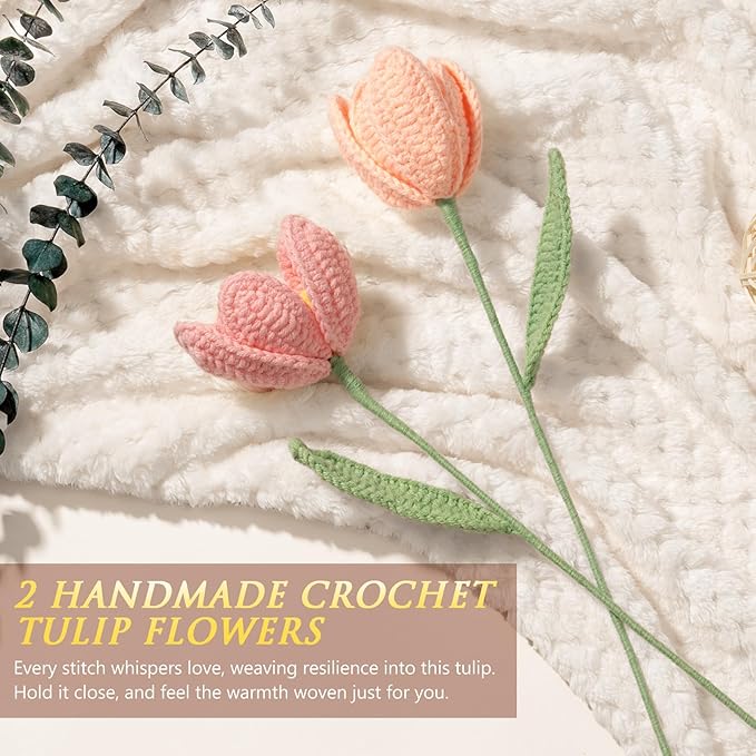- HANDMADE CROCHET TULIPS: This unique gift box for women Christmas birthday gift set includes two pink crochet tulips, carefully handcrafted from soft cotton yarn. Symbolizing happiness, love, and warmth, they gently remind her to cherish life’s simple joys. Elegant and long-lasting, they make a charming decoration or a heartfelt gift. Perfect for self care gifts care package inspirational gifts feel better gifts for women best friend teacher coworker—these tulips bring love and positive energy