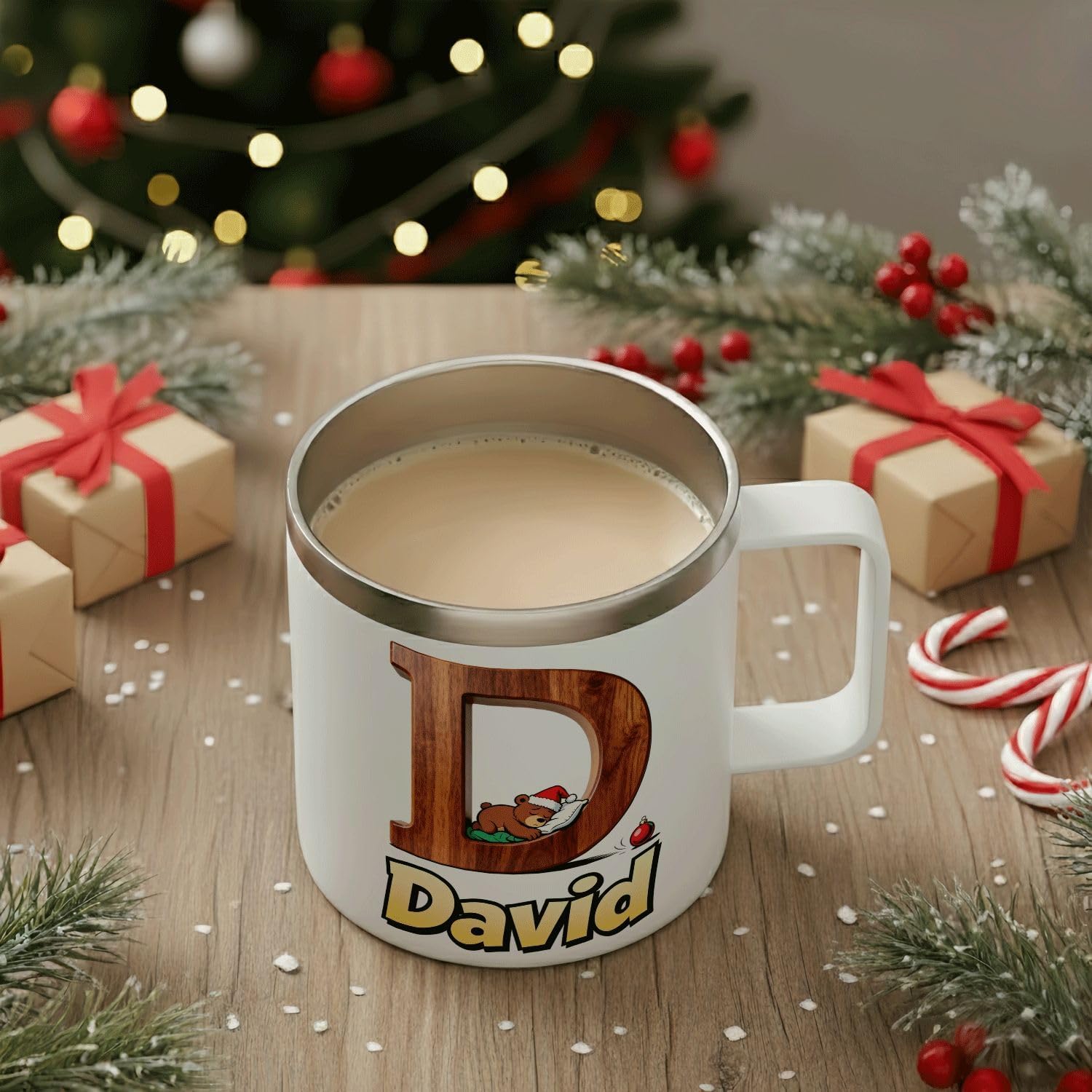 JugJug Personalized Christmas Mug with Initial & Name - Cute Sleeping Bear 12oz Insulated Coffee Cup w/Lid - Xmas Gifts for Kids, Boys, Girls (B175)