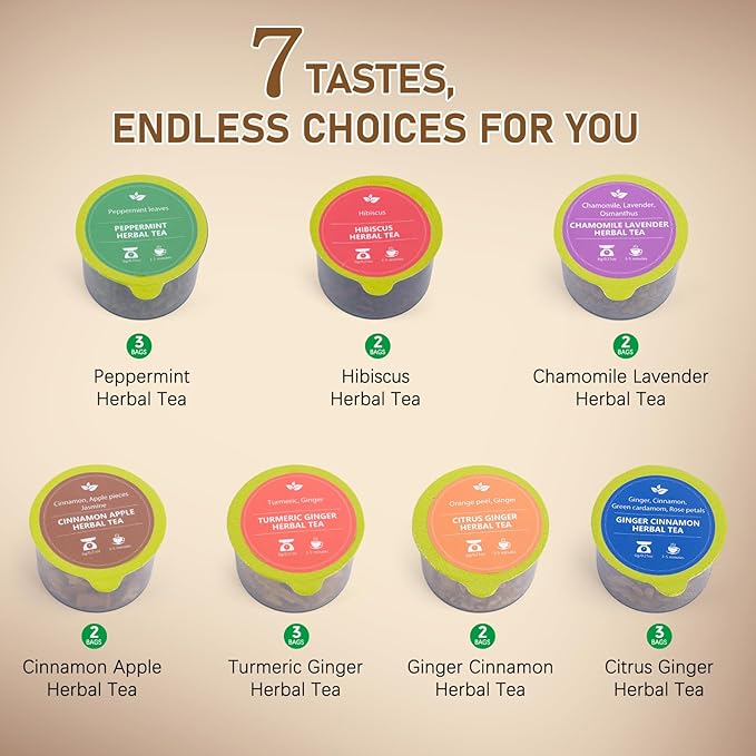 - A Variety Of Flavor Options: This pure herbal tea bag product comes with 16 independently packaged tea boxes, containing 7 unique flavors: Cinnamon Apple, Turmeric Ginger, Citrus Ginger, Chamomile Lavender, Mint, Ginger Cinnamon, Hibiscus, etc