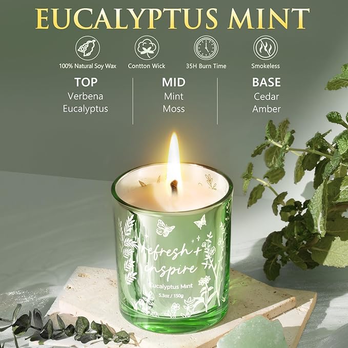 - 5.3OZ EUCALYPTUS MINT SCENTED CANDLE: A cute eucalyptus mint scented candle in this self care kit birthday spa gift baskets for women is made of pure plant essential oil & premium natural soy wax, can burn evenly up to 35 hours smokelessly & safe for family. Different from other normal candle, ours allows the light flowing through the patterns like gold and creates a magical warm glow with a unique laser-etched hollow-out design. Great for meditation, yoga, dance, spa, work, or as Xmas decor