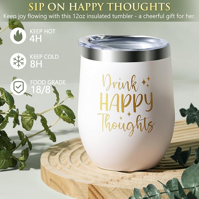 - 12OZ INSULATED TUMBLER: Crafted from premium 18/8 food-grade stainless steel, with double-walled vacuum insulation, this 12oz insulated tumbler can keep drinks cold for 8 hours & hot for 4 hours, great for iced coffee, tea, wine, juice, champagne, etc. "Drink Happy Thoughts" the warm message shows your heartfelt gesture of love & support for your loved ones, making it a thoughtful spa gift set self care package feel better gifts get well gifts thank you gifts sending big hug gifts for women